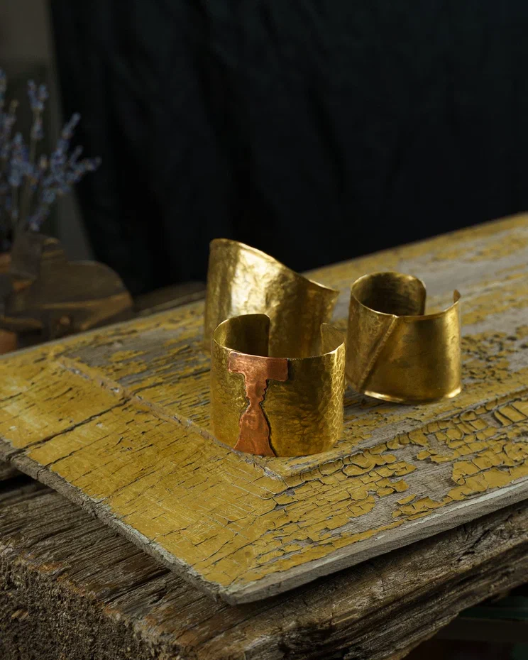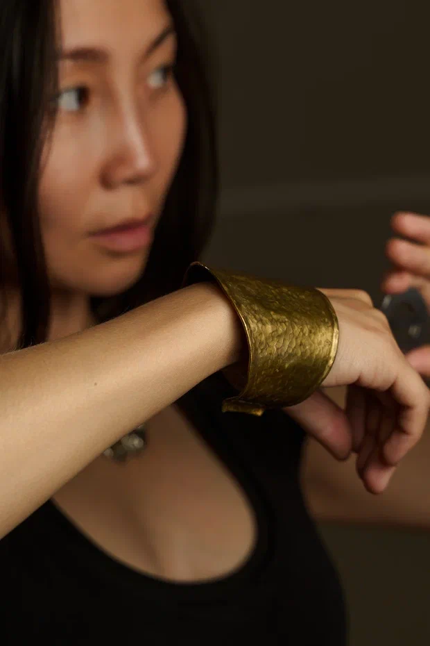 Широкий браслет аксессуар с выразительным дизайном, подчёркивающий индивидуальность и стиль. Полностью выполнен вручную из латуни, с декоративными элементами и символами.